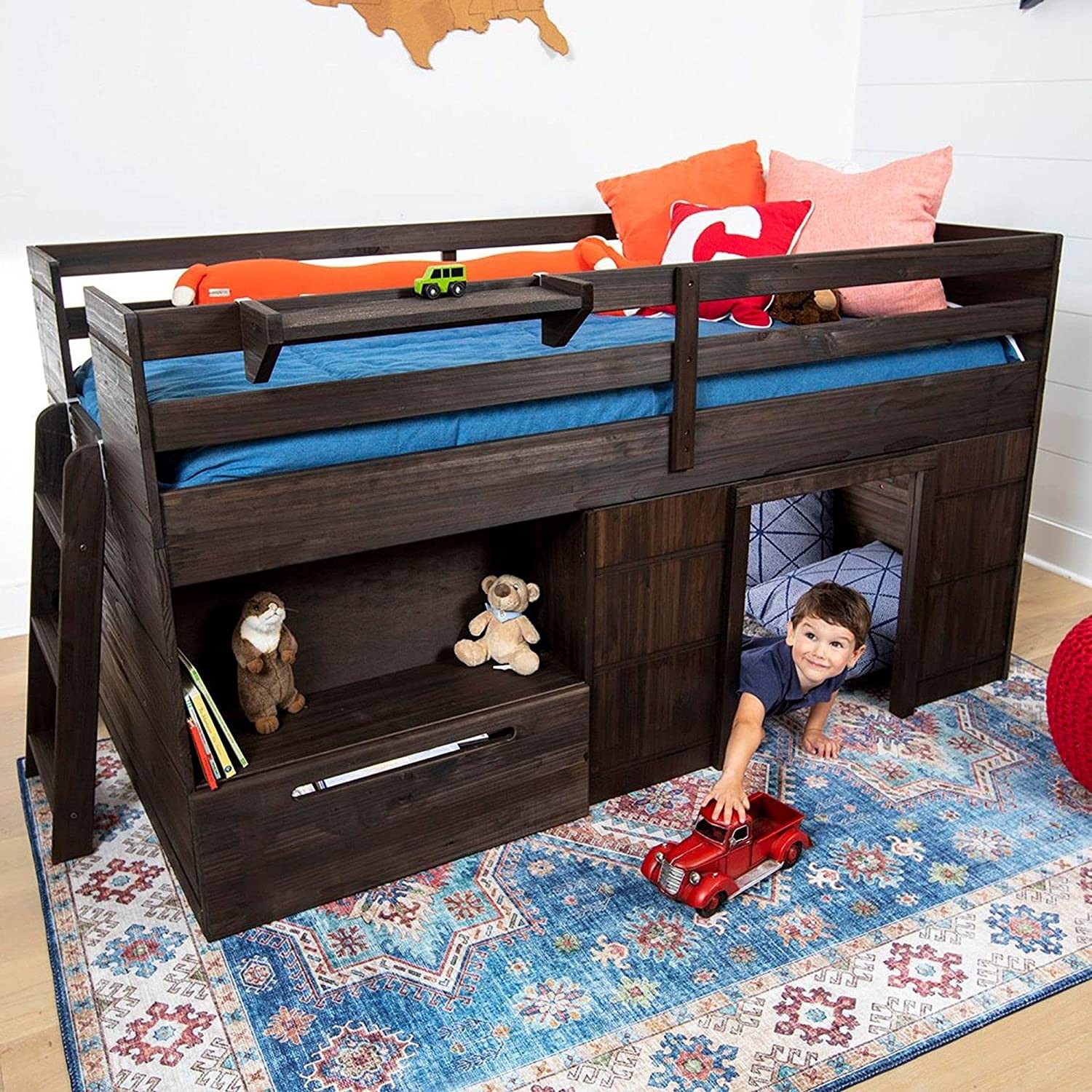 • Drawers: Double Low Loft Bed: Fun and practical, our Low Loft Kids Bed is perfect for maximizing space in your child's room; drawers, shelves and under-bed area create a drawer ideal for storage and play space