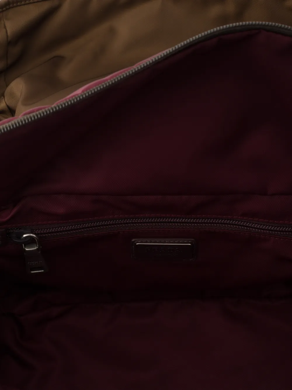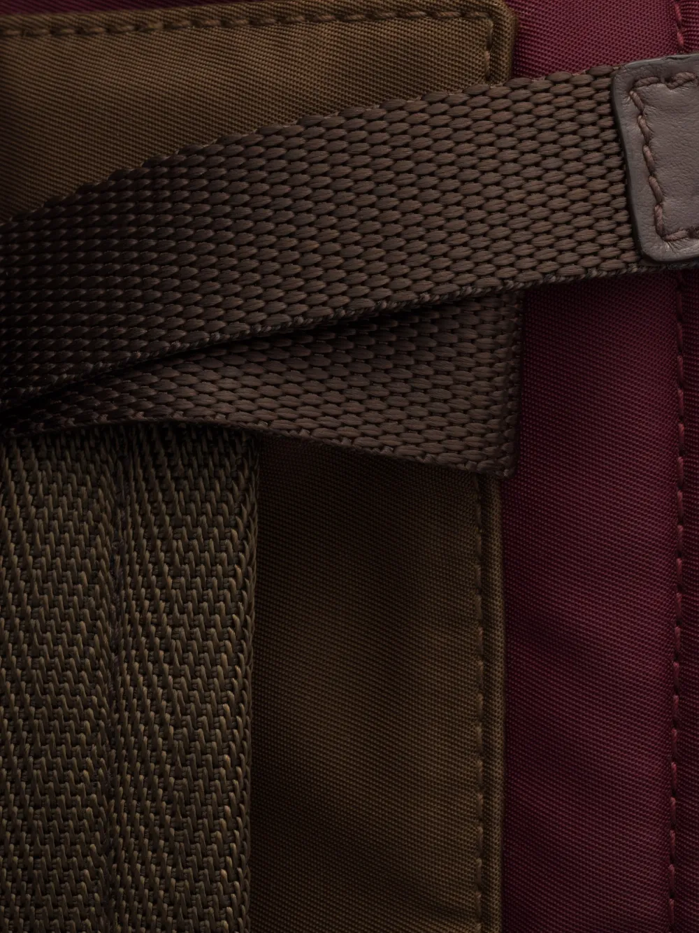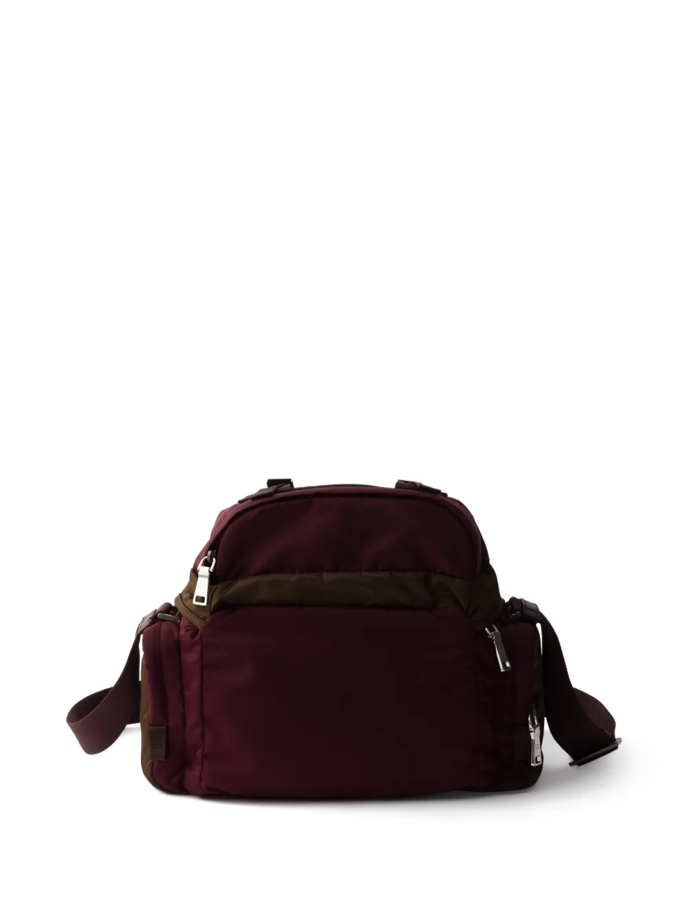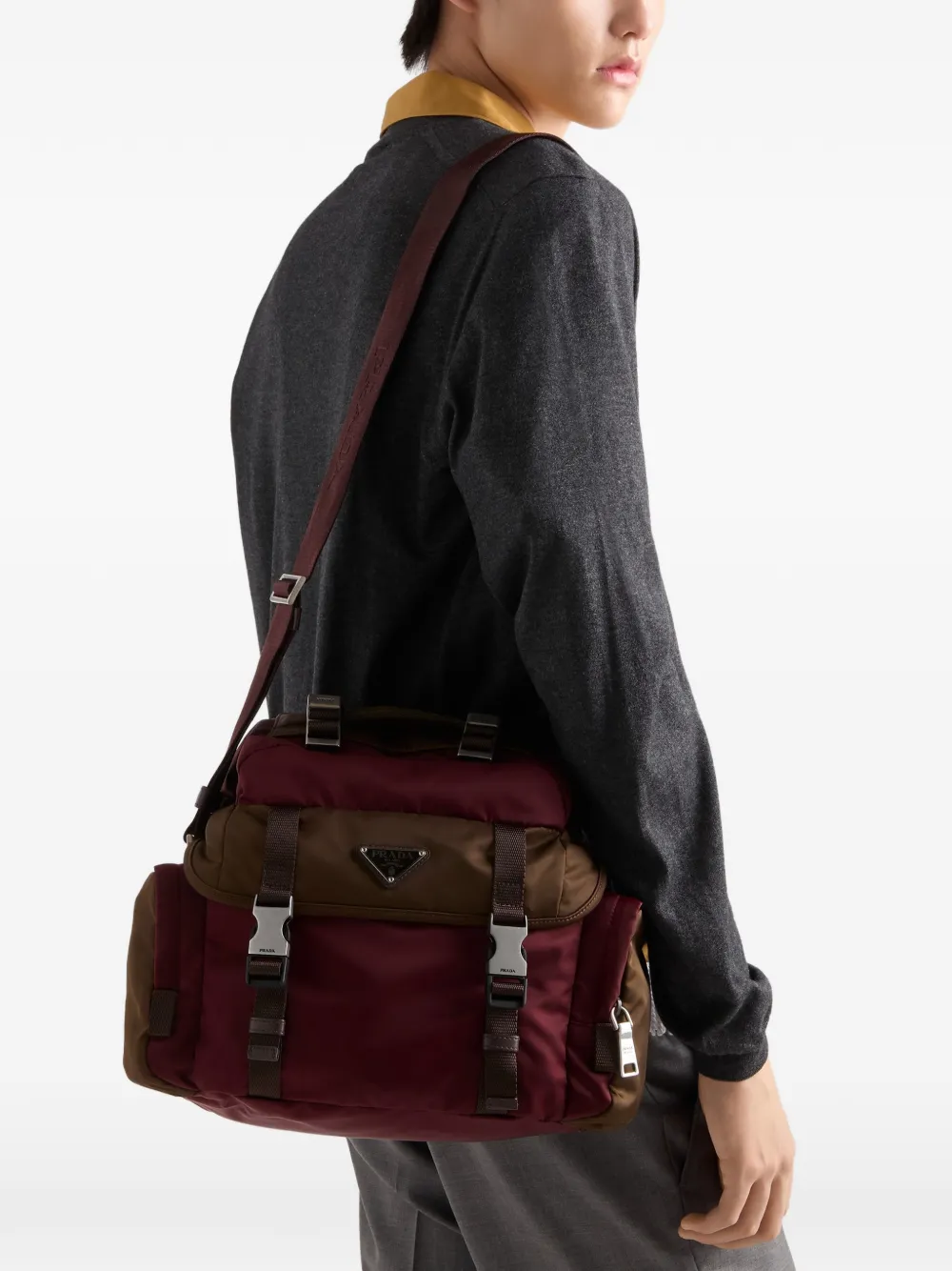 Highlights burgundy enameled triangle logo adjustable shoulder strap flap closure side-release buckles and zipper underneath external zip pockets internal zip pocket FARFETCH ID: 33409061 Brand style ID: 2VH195VOOO2DMG Composition Outer: Recycled Polyamide 100%, Calf Leather 100% Lining: Recycled Nylon 100%