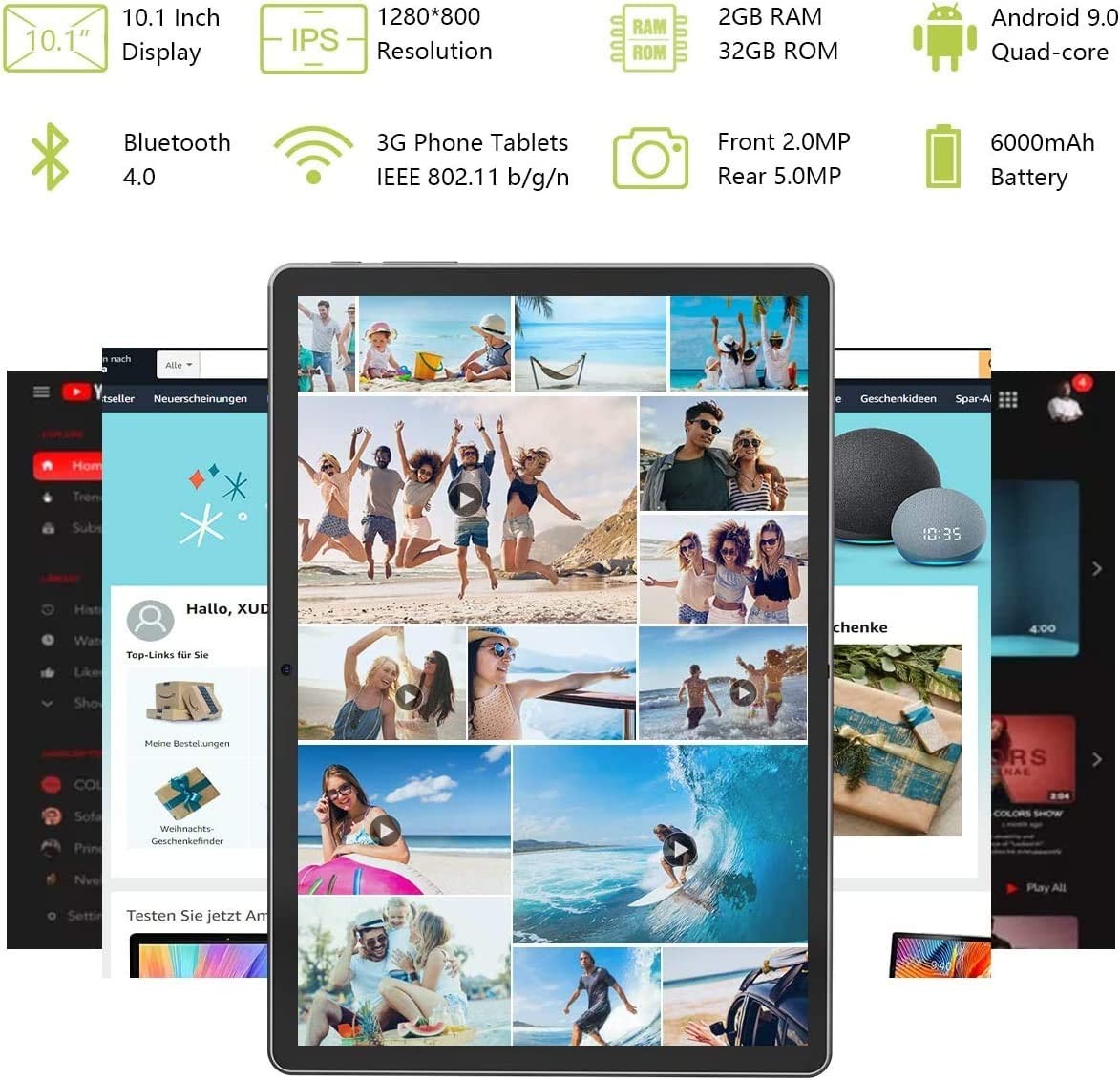 Tablet 10 Inch, Dual SIM Solt Android 9.0 Quad Core Processor Tablets, 32GB ROM 6000mAh Battery Google Certified HD Tablet, Support 128GB Memory Storage Expand, WiFi, Bluetooth, GPS